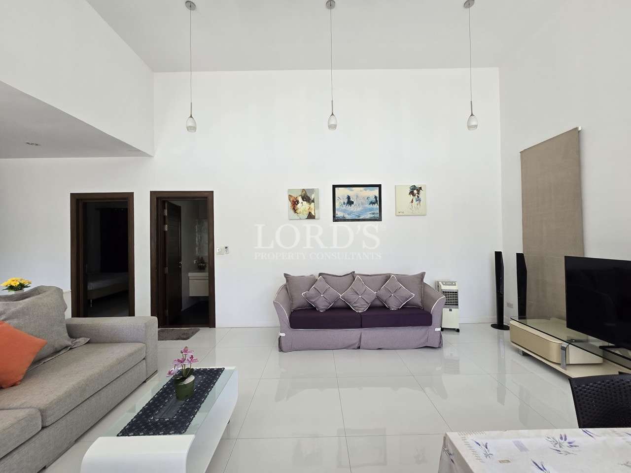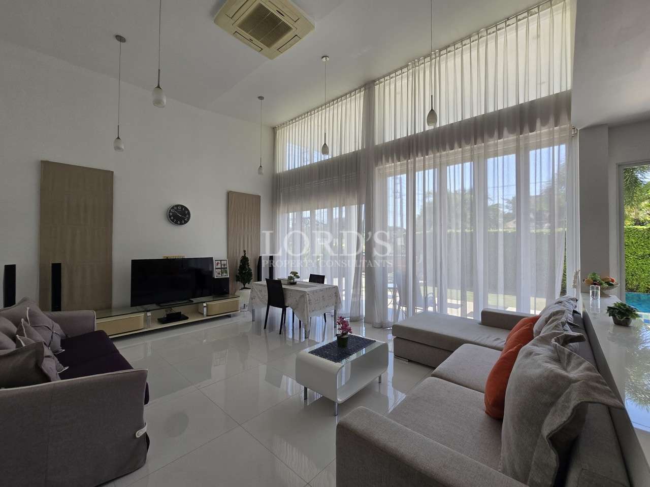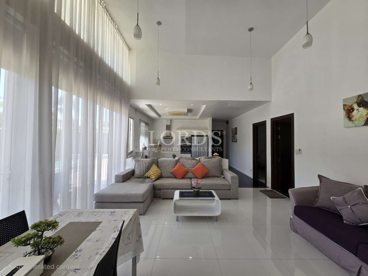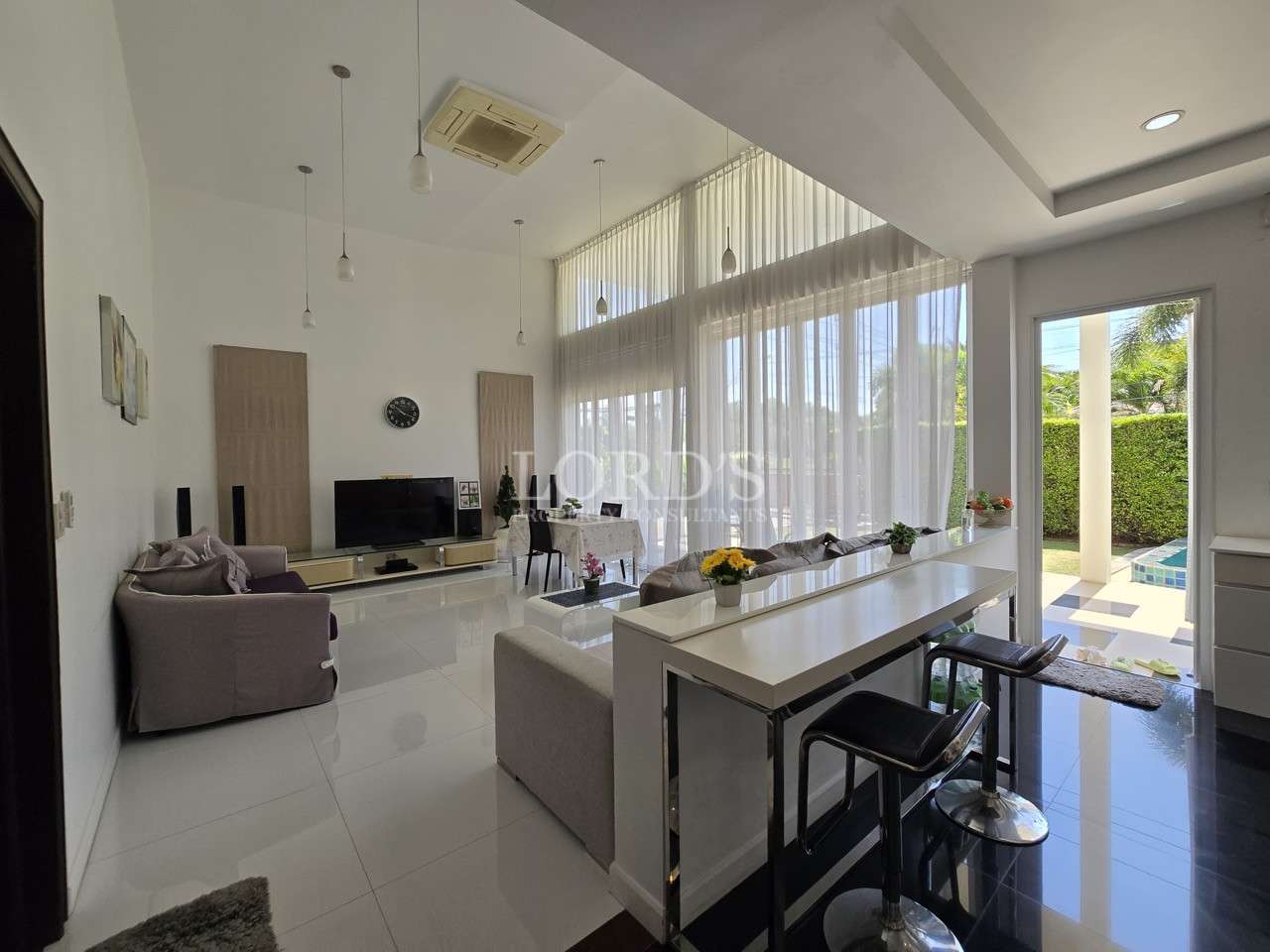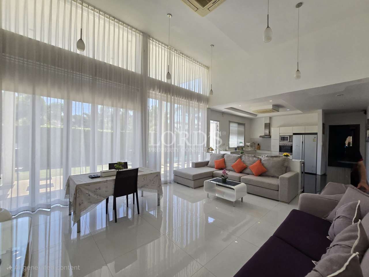 Step inside this premium villa for rent in Hua Hin 91 to find an open-plan living area bathed in natural light. The interior design emphasizes clean lines and functional elegance.