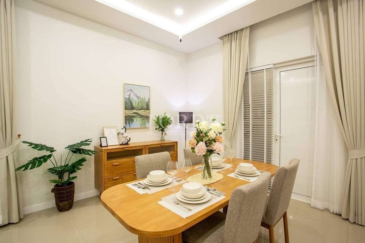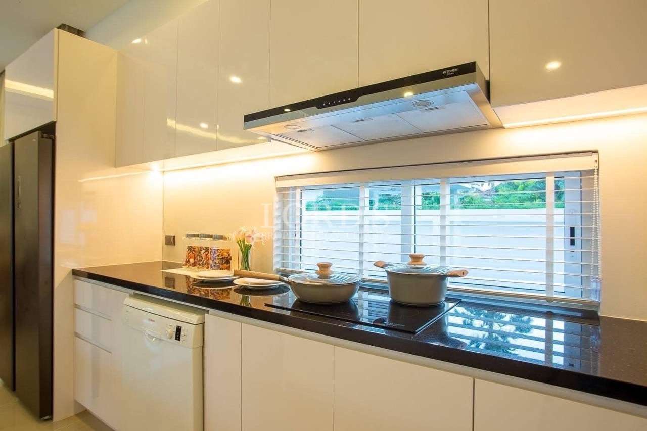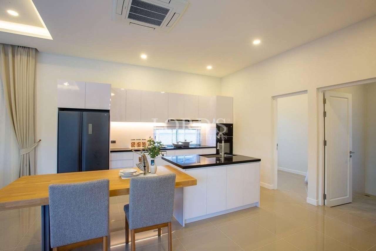 The heart of this Feng Shui 3 Bedrooms Pool Villa in Hua Hin is its open-plan living area that seamlessly connects to the outdoor space. High ceilings and large glass doors allow natural light to flood the interior while maintaining a cooling airflow throughout the day. The European-style kitchen is equipped with high-quality appliances, catering to those who enjoy culinary arts and entertaining guests.