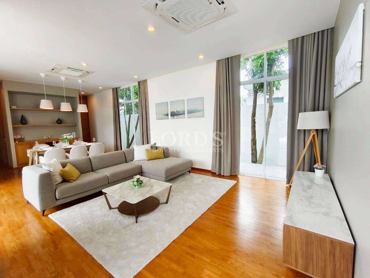 The heart of the home is the open-plan living area, which transitions seamlessly to the outdoor terrace. A private 4×8 meter swimming pool serves as the focal point of the garden, providing a cooling retreat from the tropical climate. The lush landscaping around the pool area ensures a secluded atmosphere for relaxation or entertaining guests.