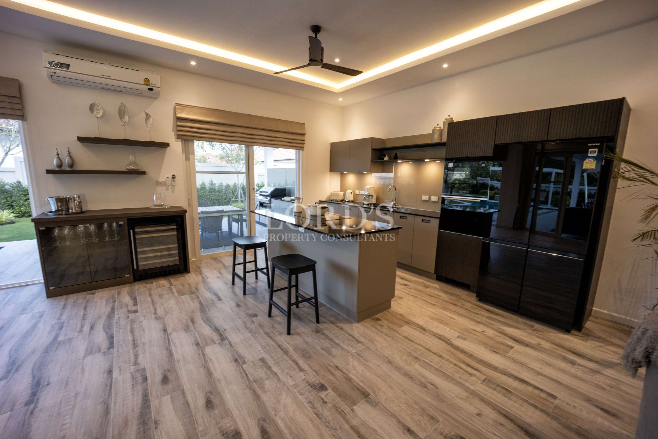 A fully equipped European-style kitchen serves as a functional masterpiece, featuring top-of-the-line appliances and sleek cabinetry. Whether you are hosting a dinner party or preparing a family meal, the layout ensures convenience. High ceilings and large glass sliding doors are standard, allowing natural light to flood the interiors while showcasing the lush tropical gardens outside.