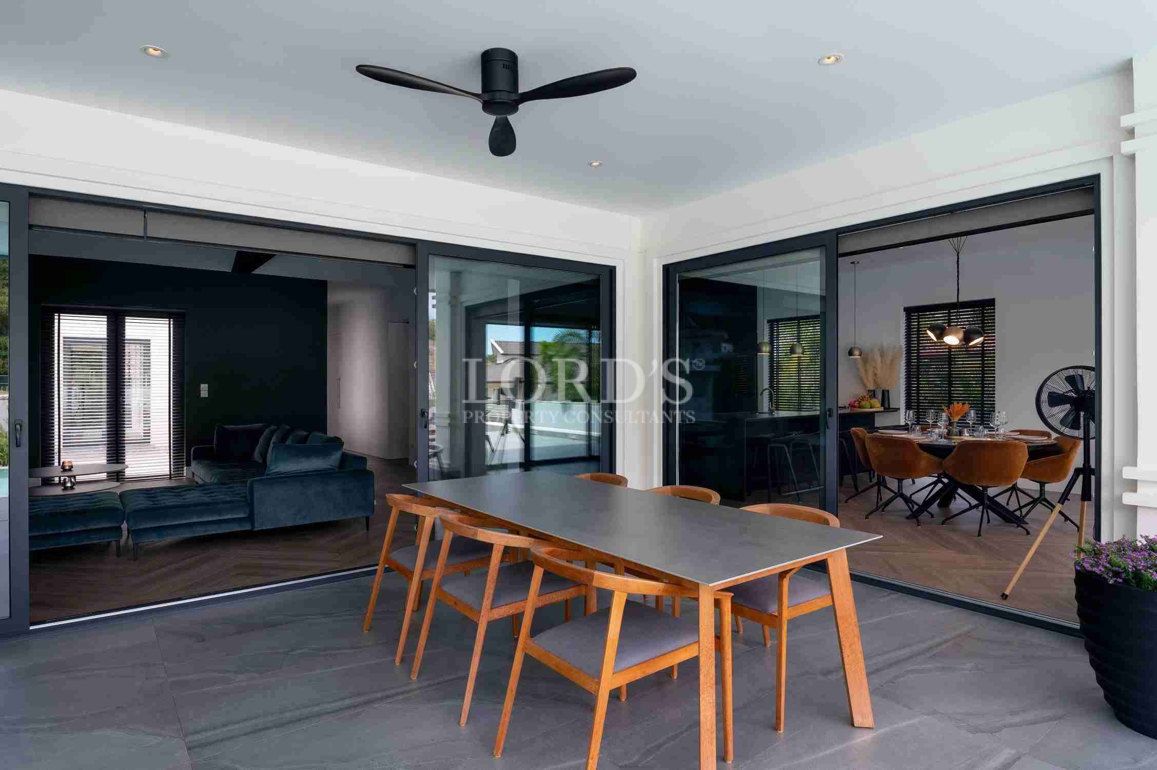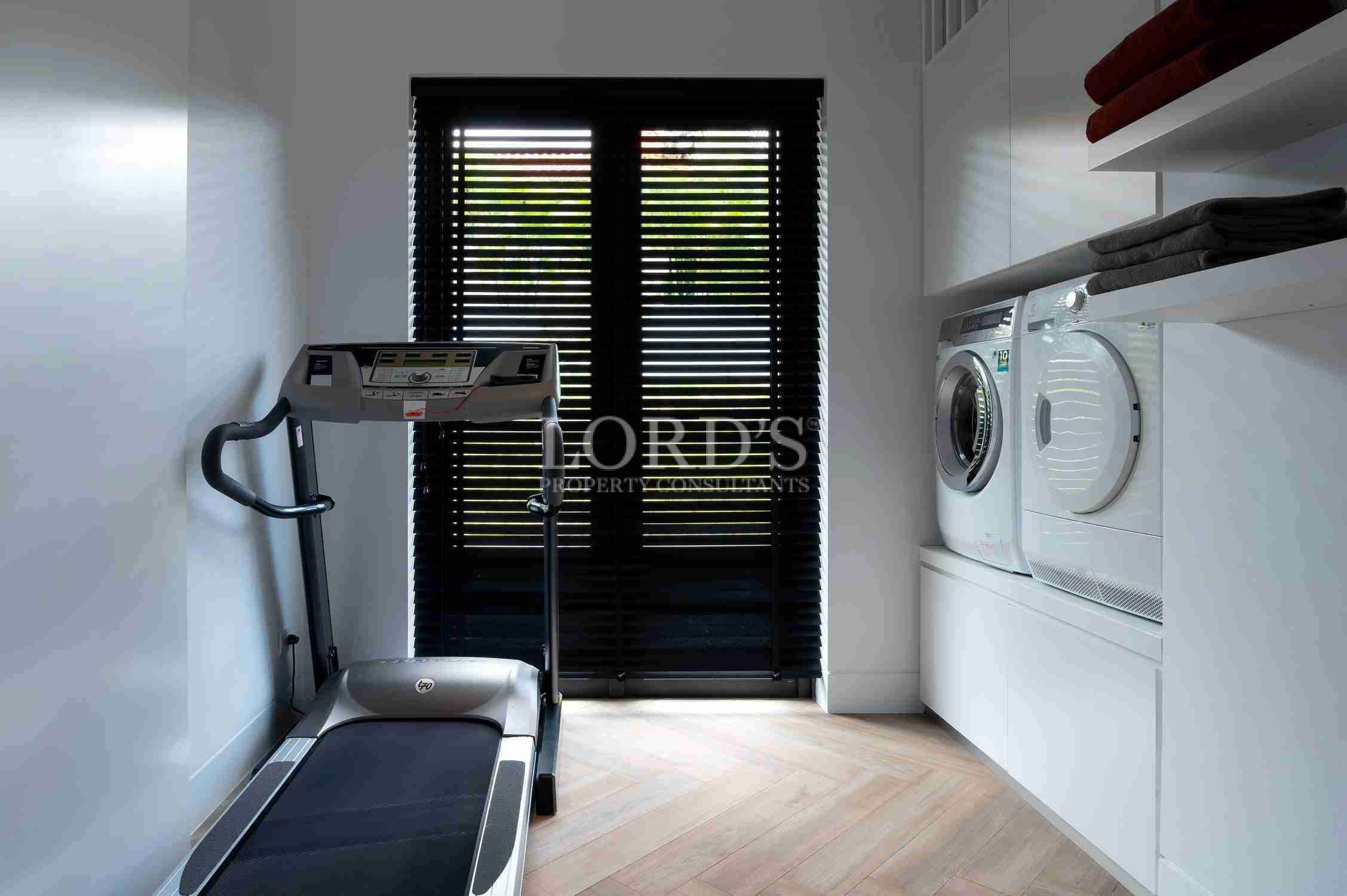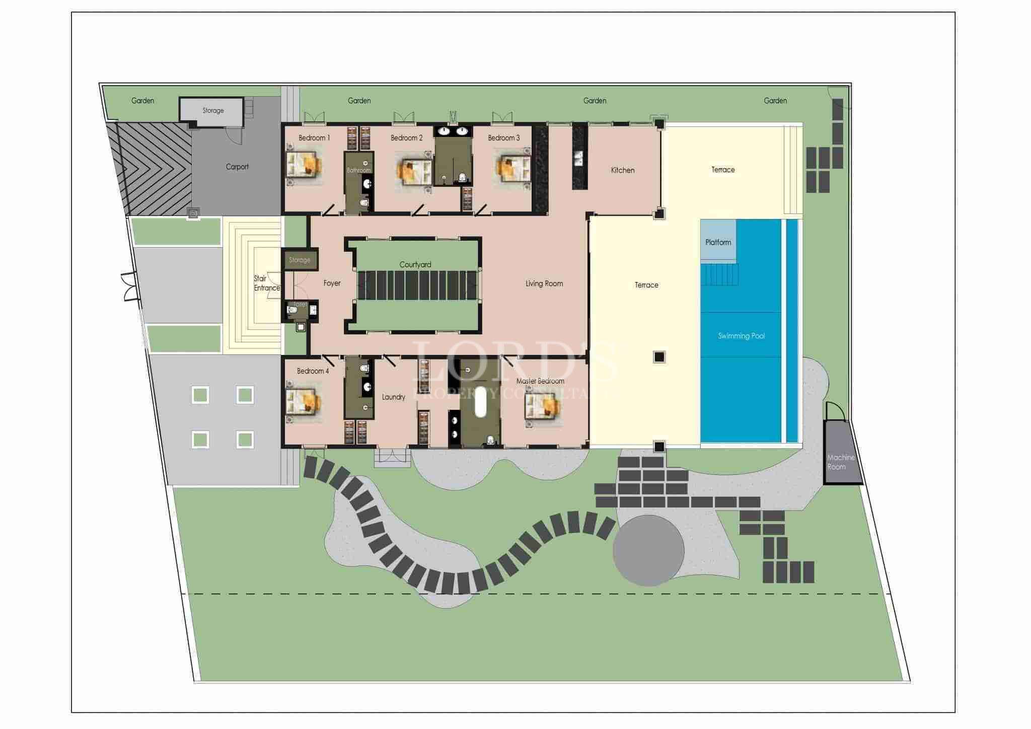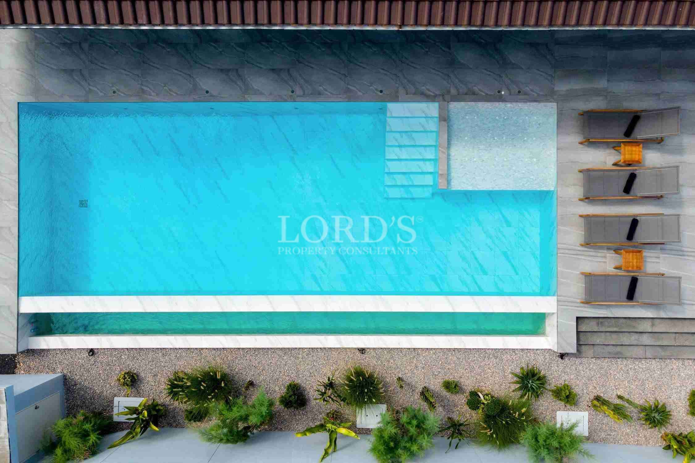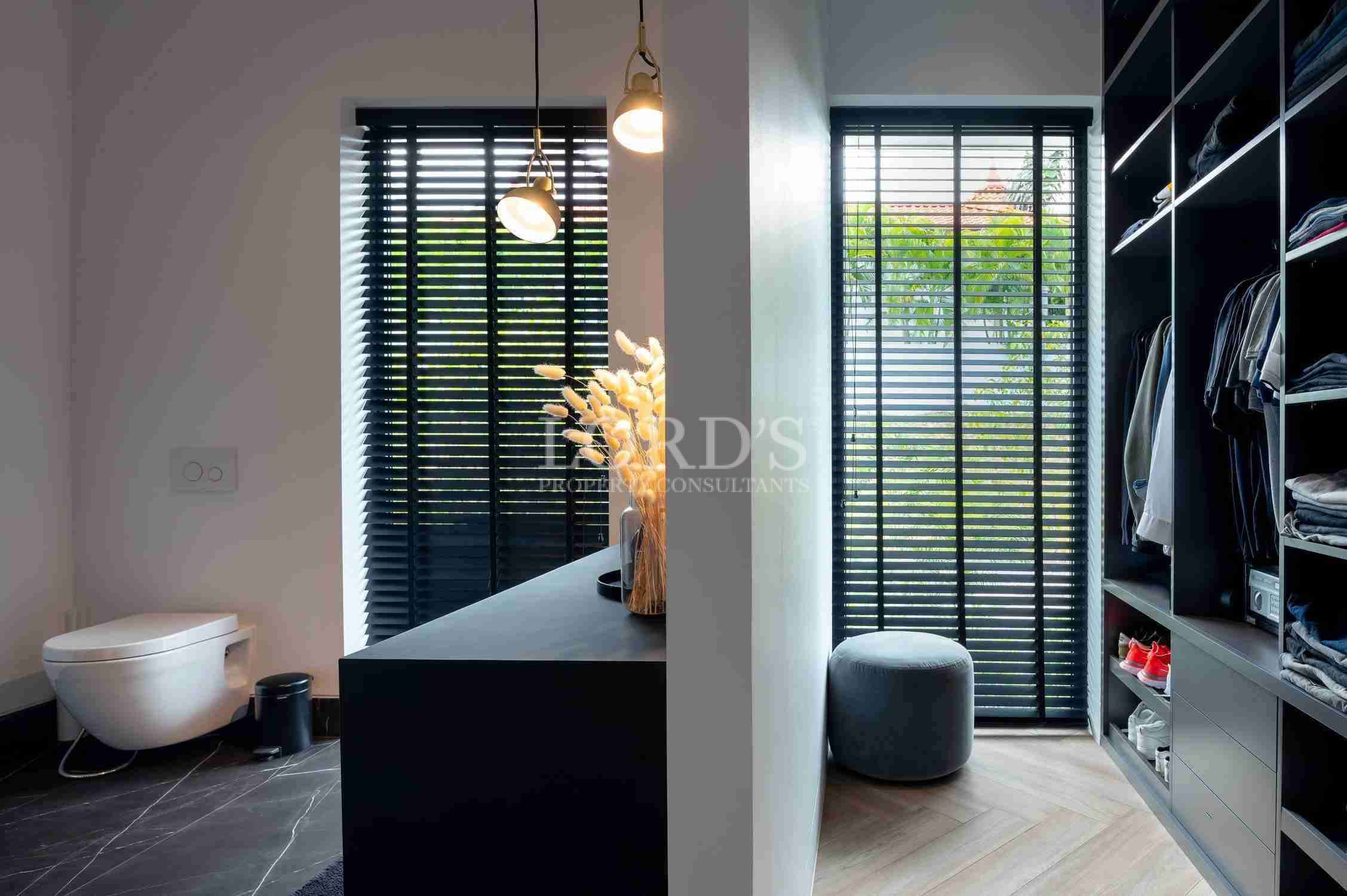 The interior layout is designed for privacy and functionality, featuring five spacious bedrooms and four modern bathrooms. The master suite offers a private sanctuary with a walk-in wardrobe and direct access to the poolside terrace. Three bedrooms include en-suite facilities, while the remaining rooms share a well-appointed bathroom. At the heart of the home, an open-plan living and dining area connects to a high-end European kitchen, complemented by a dedicated study, storage rooms, and a laundry area. High-efficiency Daikin inverter air conditioning and double-glazed aluminum windows ensure climate-controlled comfort throughout the year.