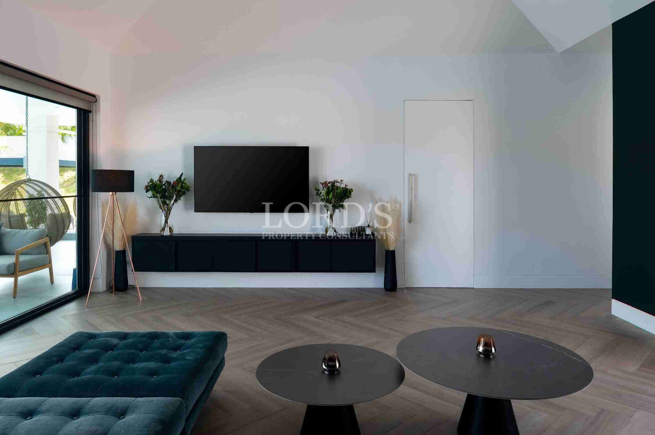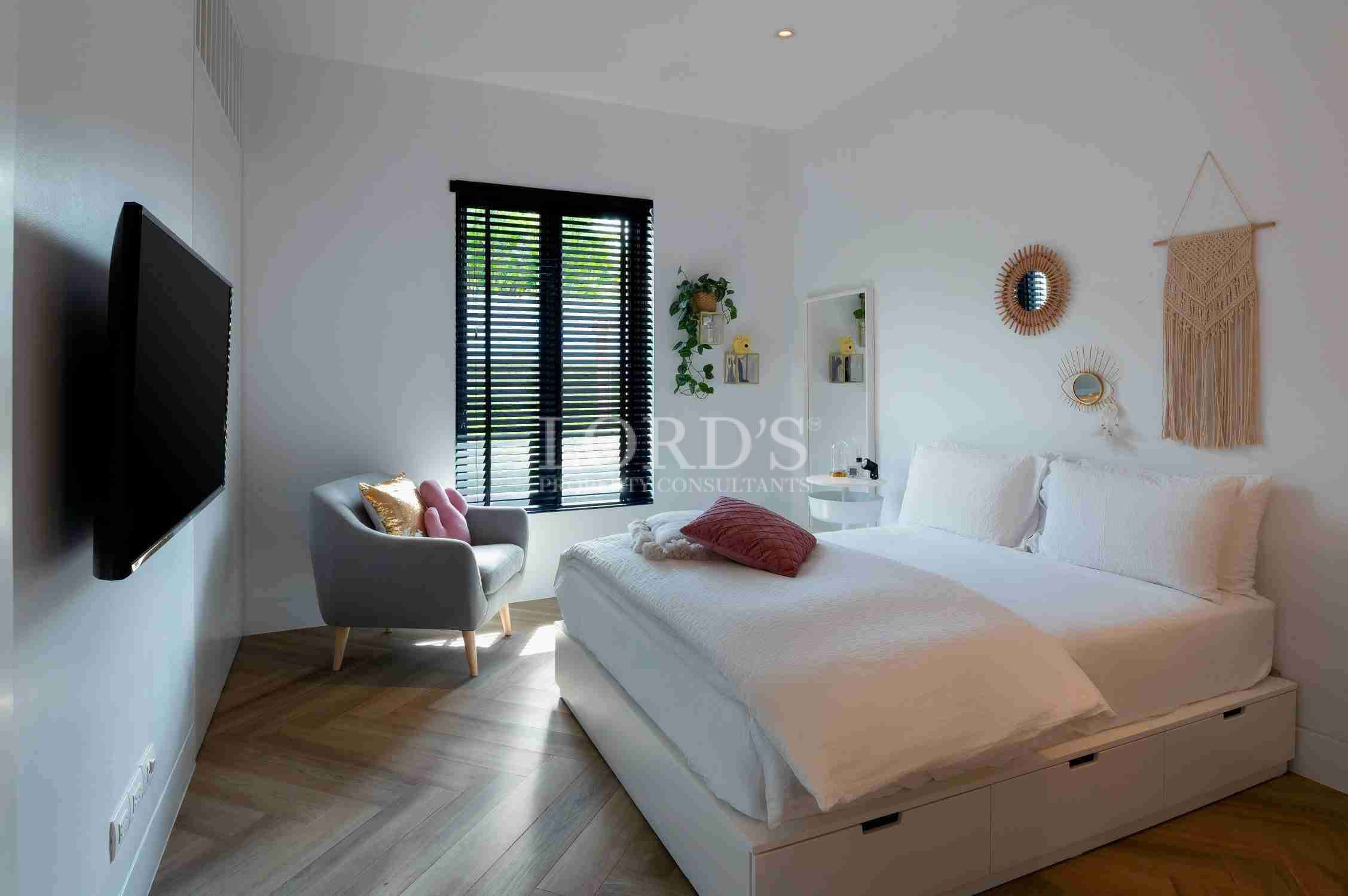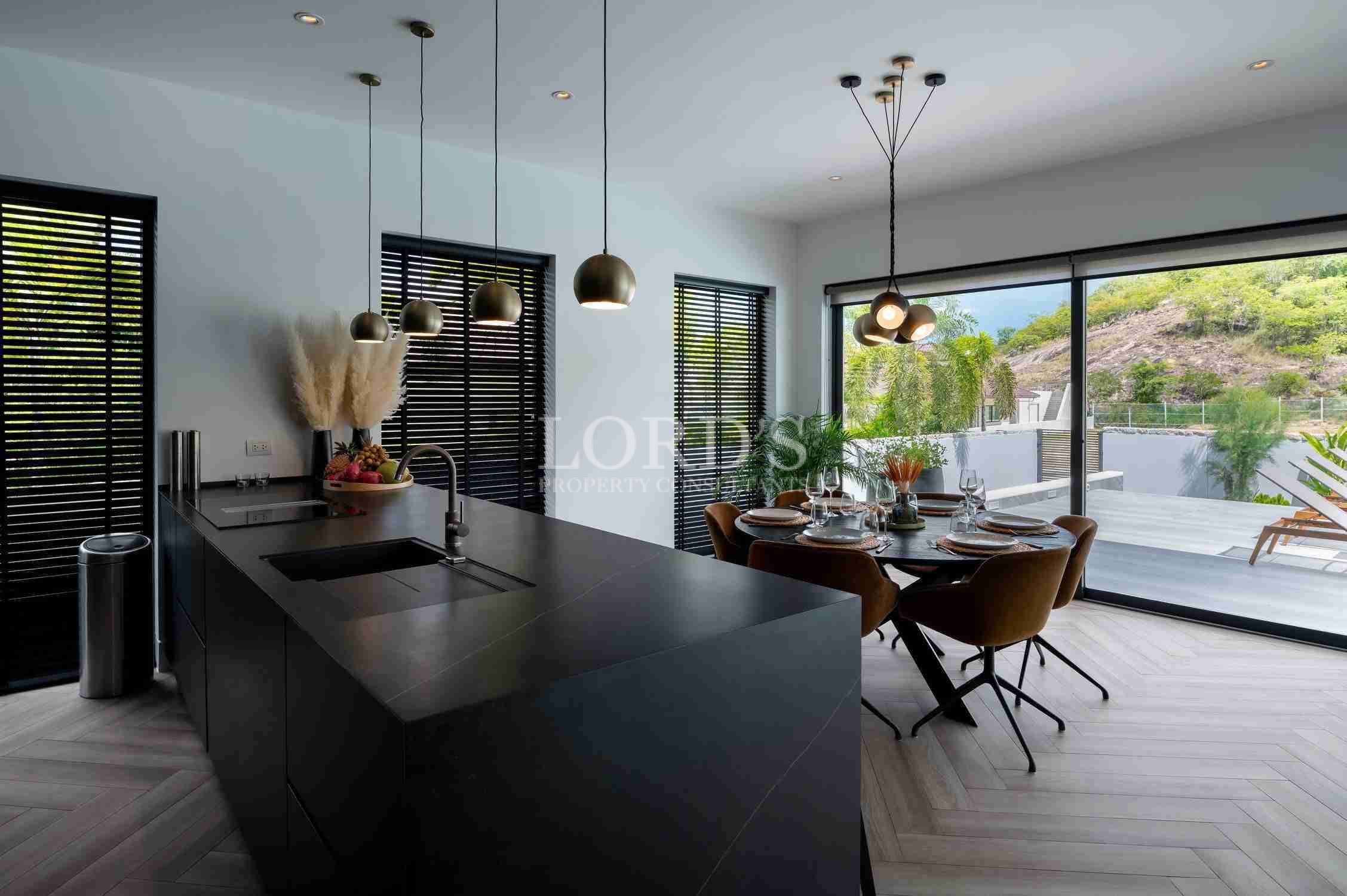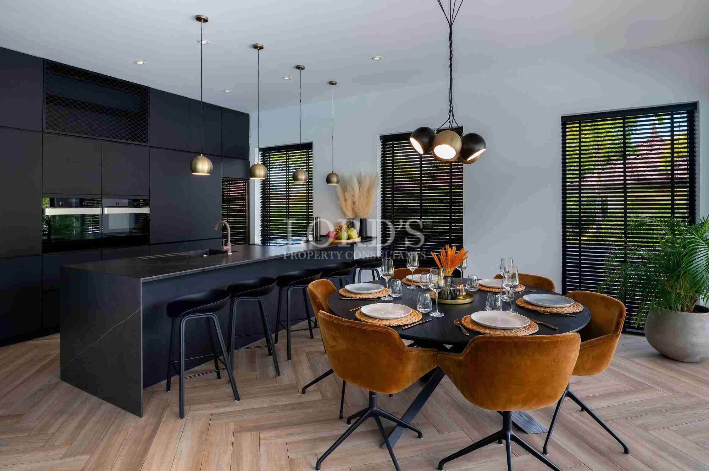 The interior layout is designed for privacy and functionality, featuring five spacious bedrooms and four modern bathrooms. The master suite offers a private sanctuary with a walk-in wardrobe and direct access to the poolside terrace. Three bedrooms include en-suite facilities, while the remaining rooms share a well-appointed bathroom. At the heart of the home, an open-plan living and dining area connects to a high-end European kitchen, complemented by a dedicated study, storage rooms, and a laundry area. High-efficiency Daikin inverter air conditioning and double-glazed aluminum windows ensure climate-controlled comfort throughout the year.