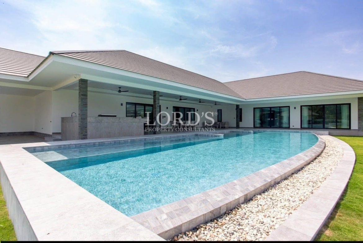 Located in the Hin Lek Fai district of Hua Hin, a newly completed 5 bedroom luxury pool villa is available for purchase. Positioned adjacent to the Black Mountain Golf Course and Hua Hin International School, the fully furnished residence provides a turnkey solution for families and investors seeking premium real estate.