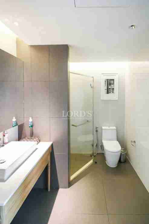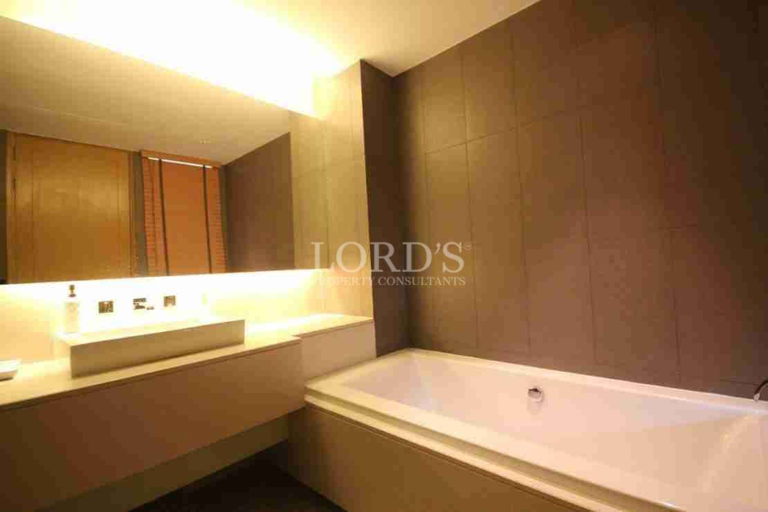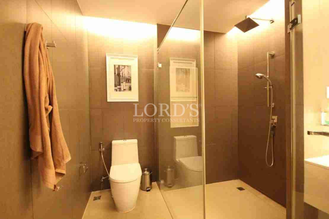 The master bedroom serves as a private retreat, complete with a built-in wardrobe, television, and an en-suite bathroom featuring high-standard fittings and a bathtub. The second bedroom is equally well-appointed with a contemporary finish and its own en-suite bathroom.