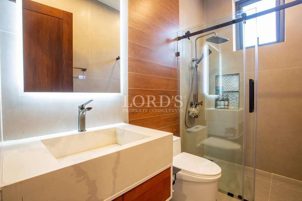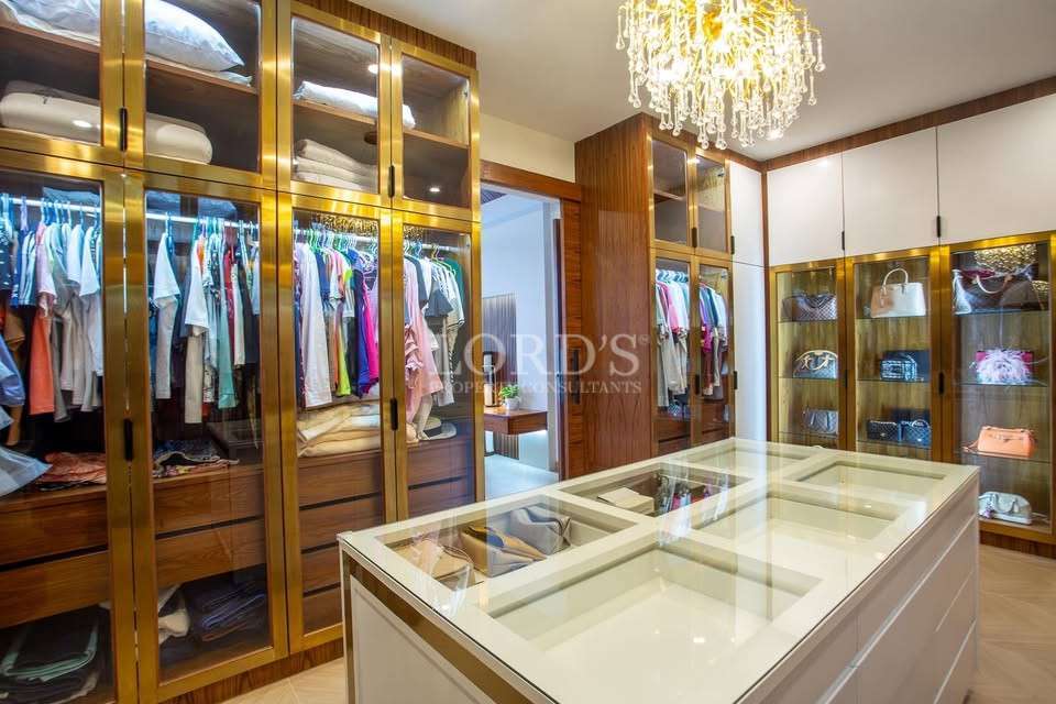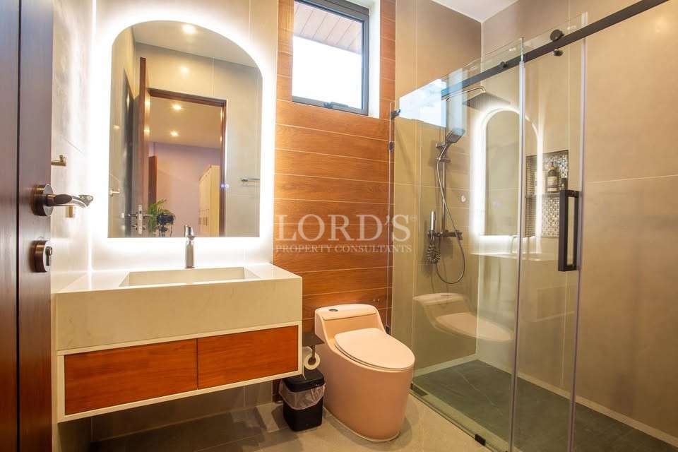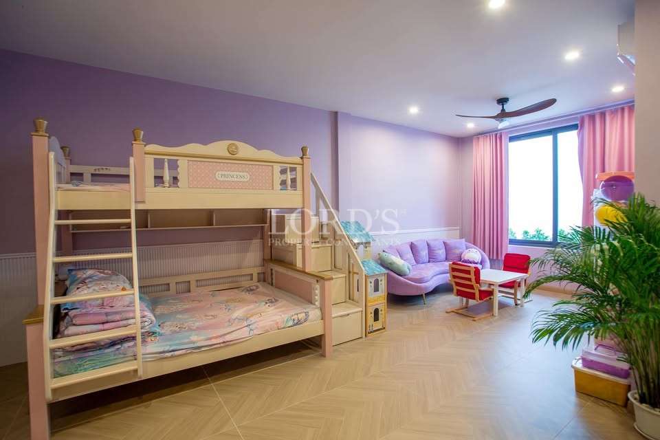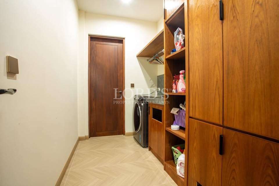Every bedroom in this 5 bedroom pool villa Hua Hin City is designed as a private sanctuary. The master suite includes a beautiful walk-in closet with ample storage for high-end wardrobes. With 6 bathrooms in total, every resident enjoys privacy and convenience. The inclusion of a dedicated maid quarter and a separate laundry room ensures that household operations remain discrete and organized.
