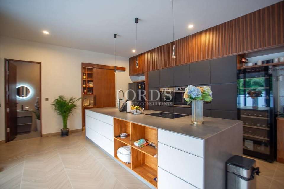 The heart of the home features an open-plan living area that flows into a premium European kitchen provided by KVIK. This culinary space is complemented by a separate pantry room, ensuring the main kitchen remains a clean social hub. For those working from home or maintaining a fitness routine, the villa includes a dedicated office and a private fitness room.