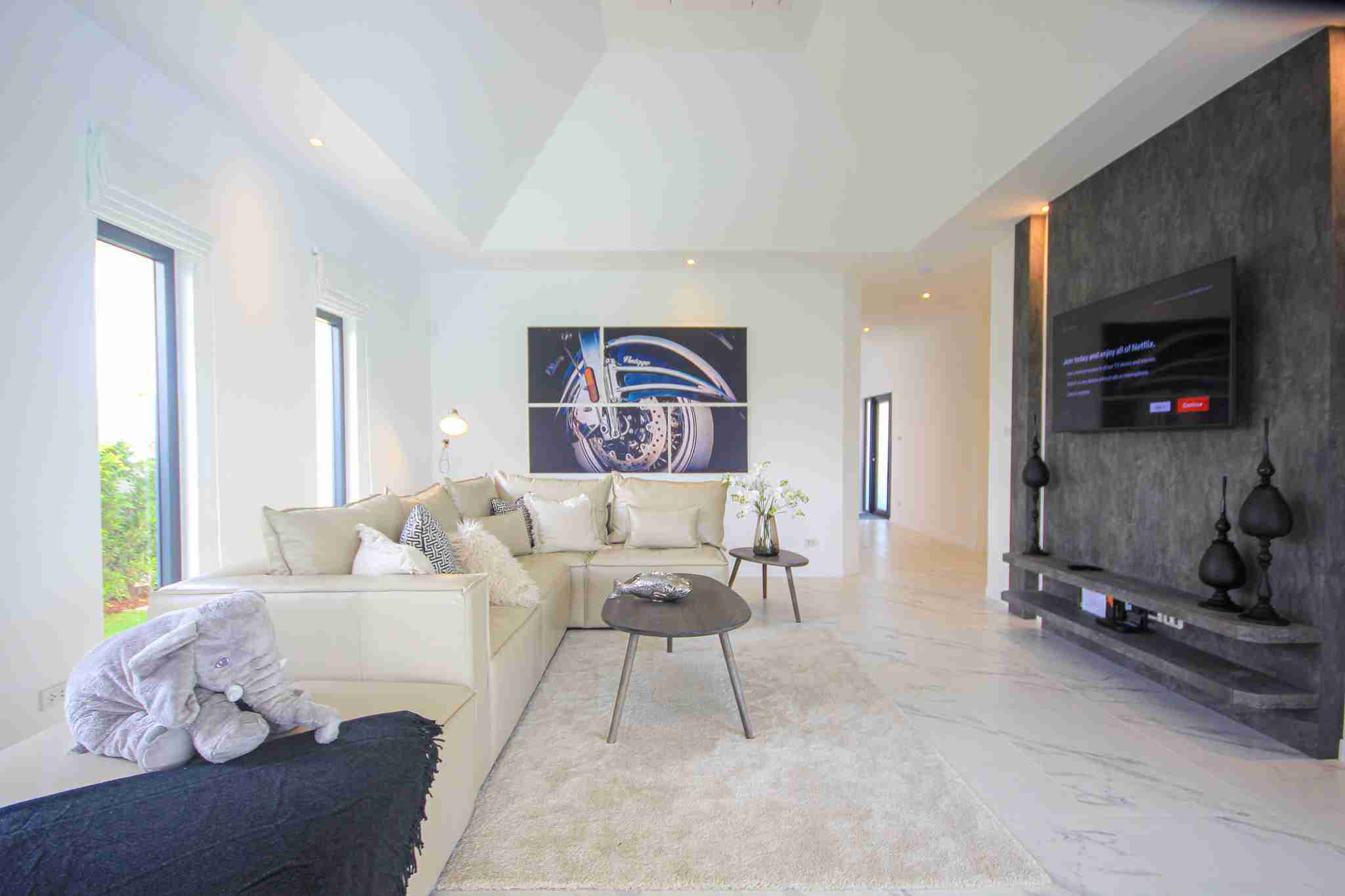 Vaulted ceilings in the open-plan living and dining areas create an immediate sense of grandeur and airiness. The interior includes three well-appointed bedrooms and three bathrooms, with the master suite offering a walk-in closet and direct terrace access. A dedicated laundry room and built-in wardrobes throughout provide practical storage solutions, while all rooms are equipped with air conditioning to ensure comfort in the Thai climate.