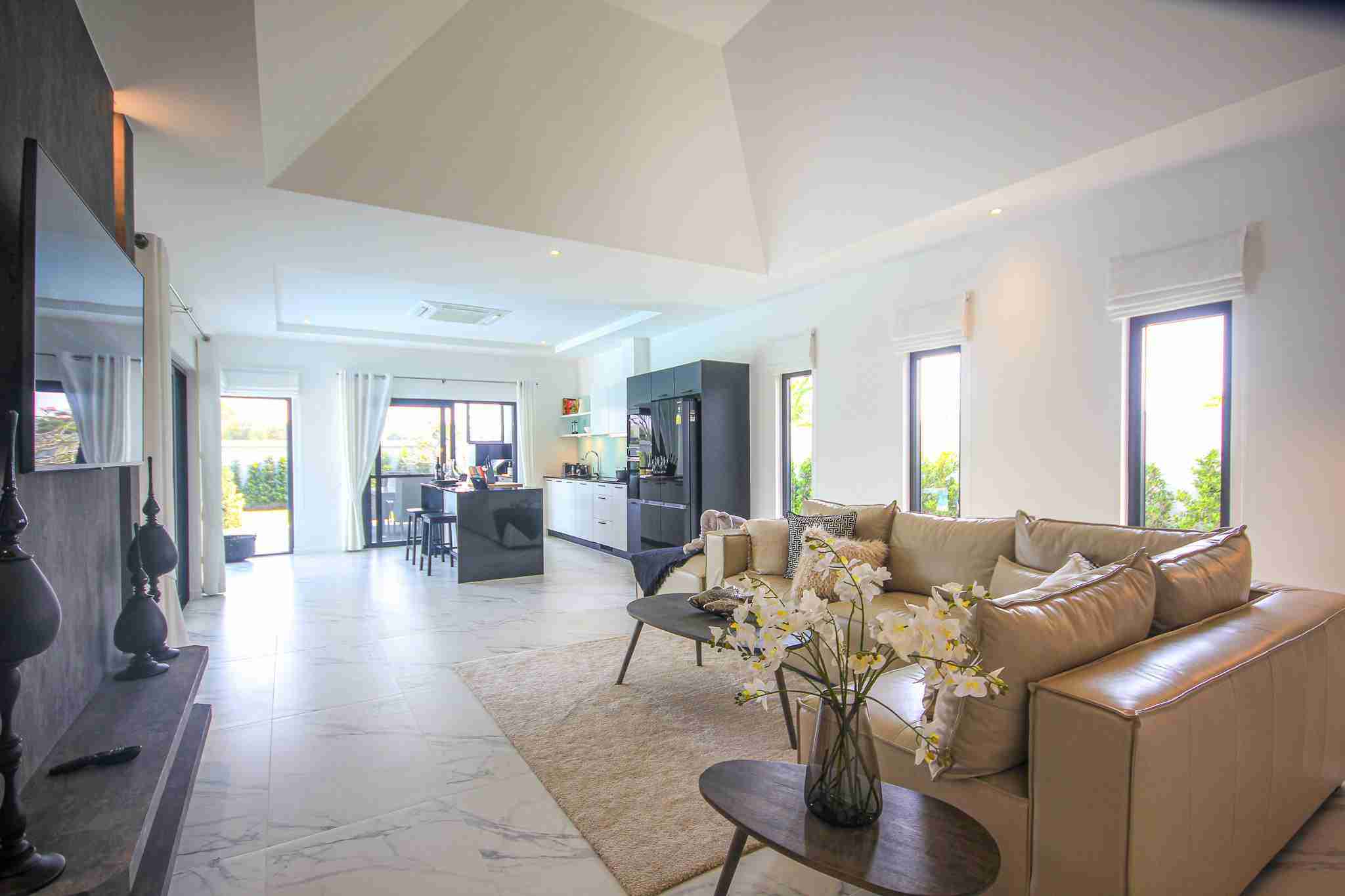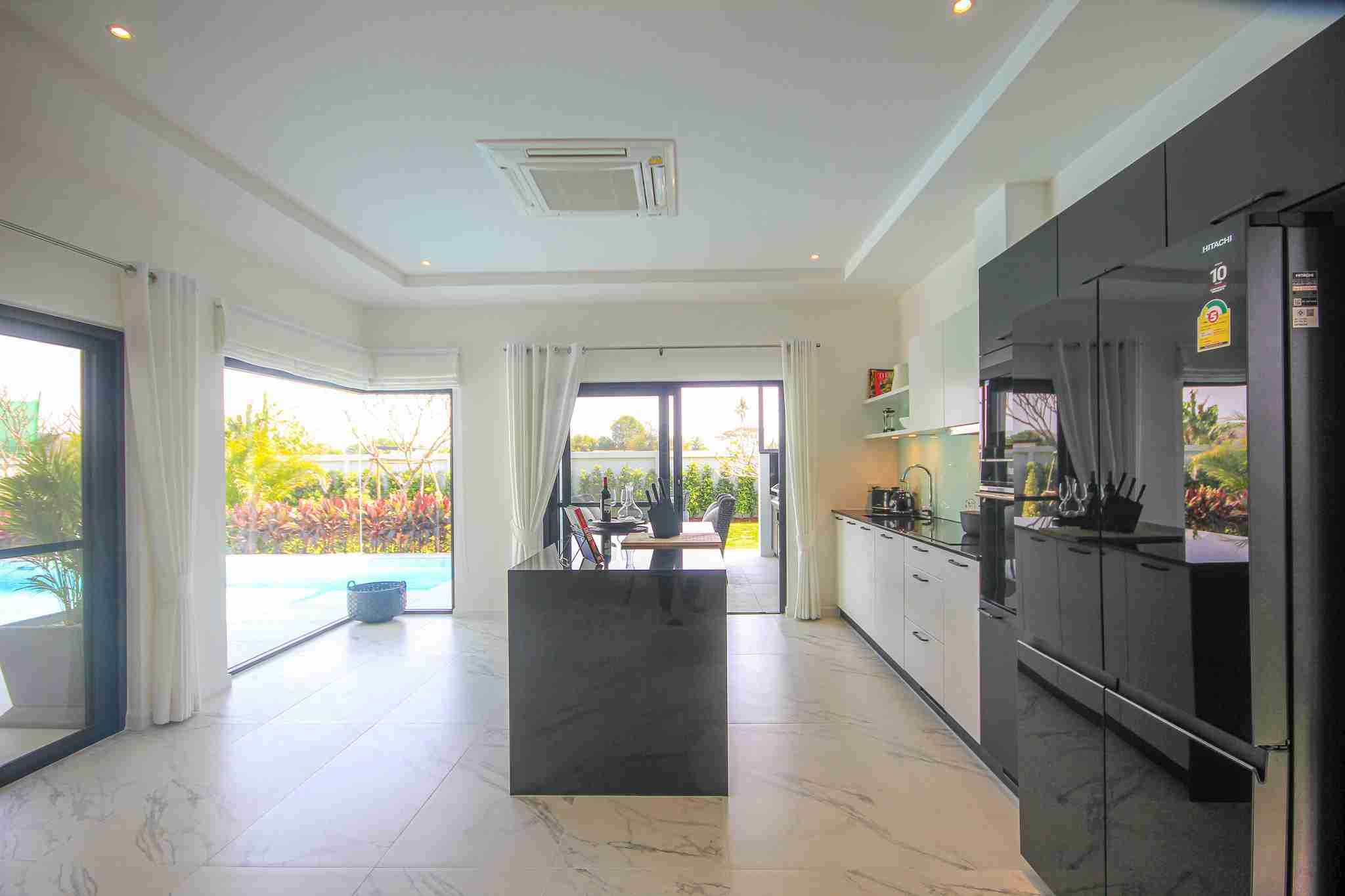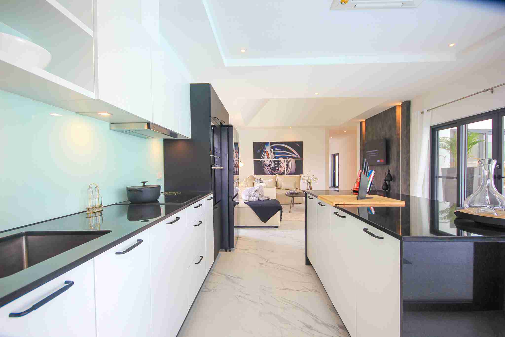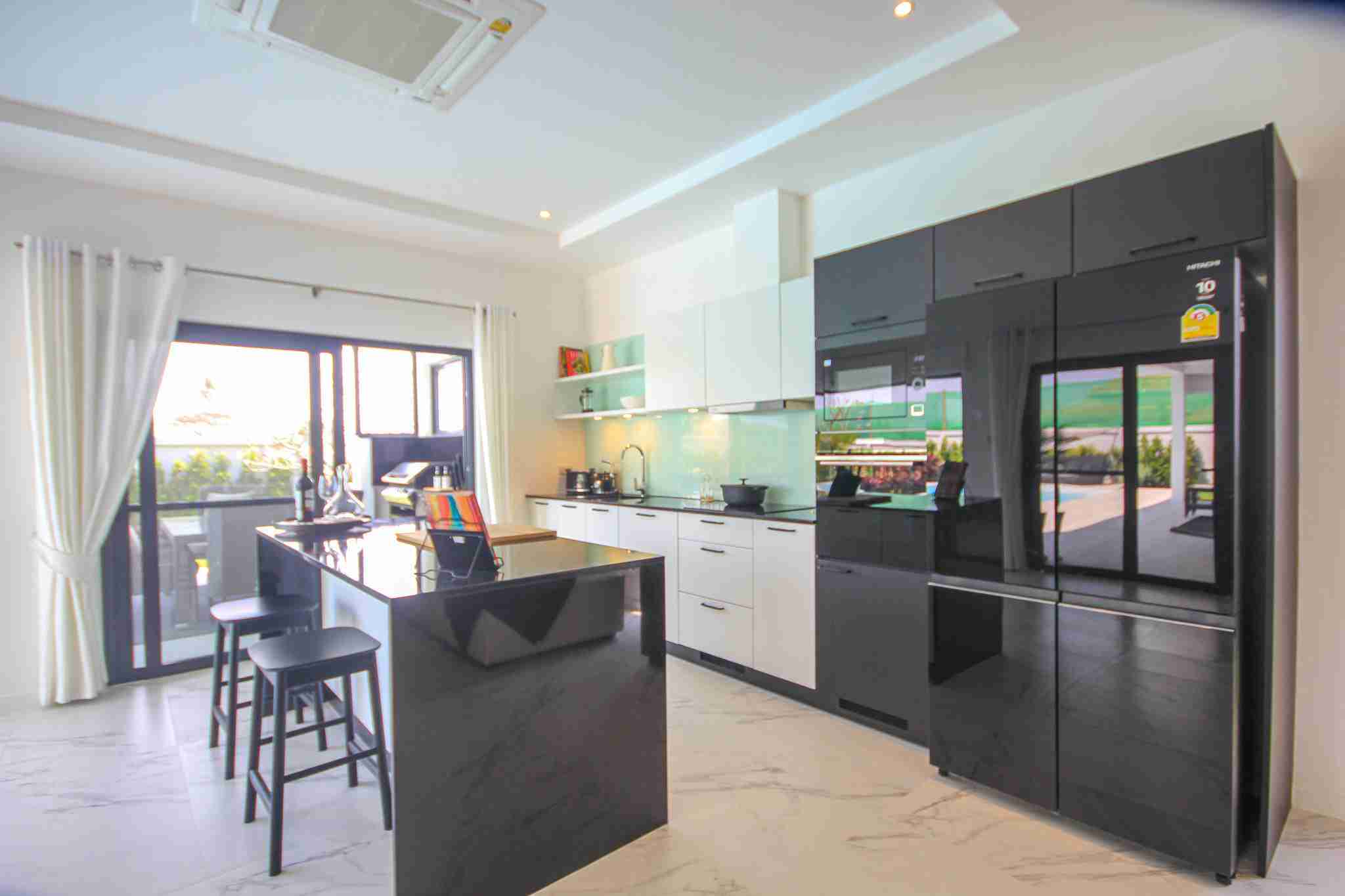 Each villa features a designer European kitchen from the Danish company Kvik, equipped with modern built-in appliances. Buyers benefit from a 350,000 Baht furniture voucher to customize their home through Beautiful World Hua Hin. This integration of top-tier brands ensures that the aesthetic appeal of the home is matched by its functional durability.